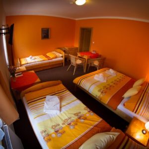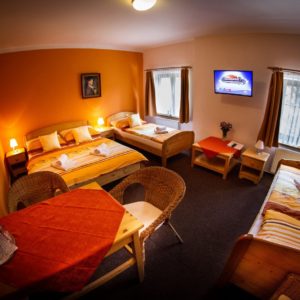 Čtyřlůžkové pokoje jsou nově a komfortně zařízené a jsou vybaveny vlastní koupelnou s WC, umyvadlem a sprchou. Ve všech pokojích máte k dispozici také televizi, připojení k internetu, stůl se židlemi a dostatek úložných prostor. Všechny pokoje jsou nekuřácké.